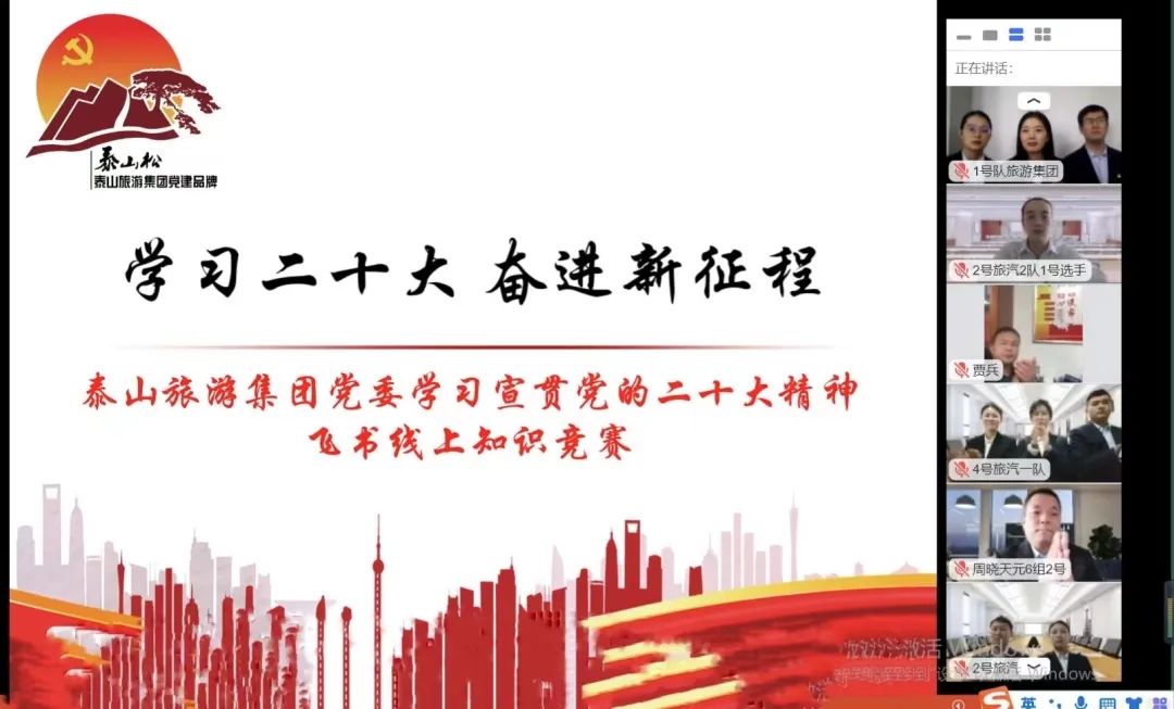 學習貫徹黨的二十大精神是泰山旅游集團當前的首要政治任務(wù)和頭等大事,集團黨委緊緊圍繞泰山文旅集團關(guān)于學習宣傳貫徹黨的二十大“快、實、深”的要求,迅速掀起學習熱潮、營造濃厚氛圍。鑒于疫情影響,11月3日下午在飛書線上舉辦了“學習二十大 奮進新征程”知識競賽,集團及各子公司6支代表隊18名選手進行了多輪精彩激烈的答題,拉開了泰山旅游集團學習宣傳貫徹黨的二十大精神系列活動的序幕。