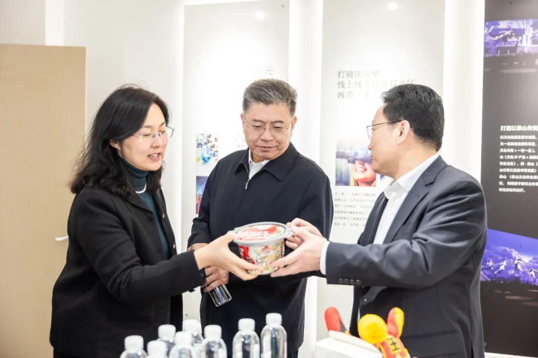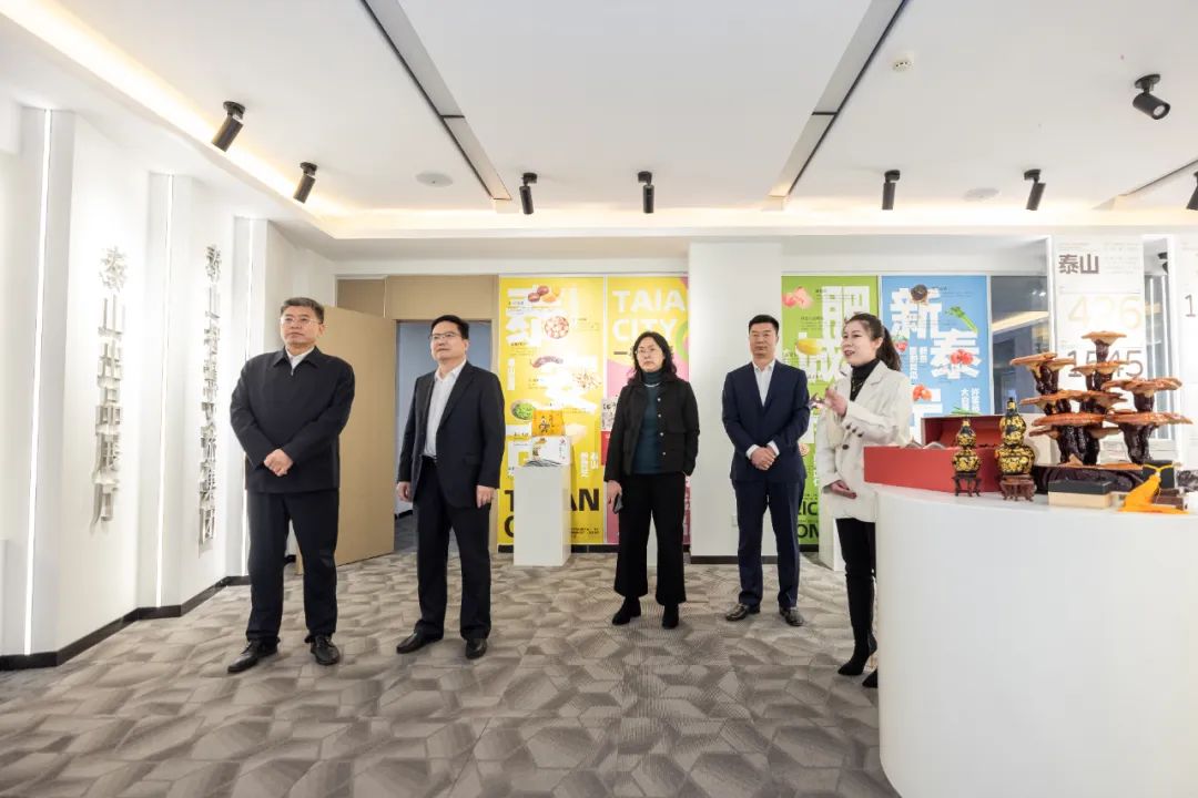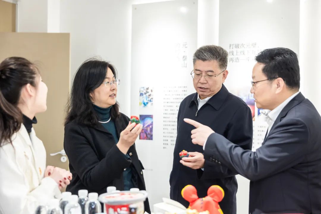 郭德文一行對(duì)智慧文旅基地、電商直播間、文創(chuàng)研發(fā)中心等區(qū)域進(jìn)行了實(shí)地參觀。并現(xiàn)場(chǎng)聽取工作人員對(duì)以泰山IP為核心的“泰山出品文創(chuàng)系列”、“元泰山數(shù)字科技”、“朝山歸文旅品牌”以及“泰山產(chǎn)品供應(yīng)鏈”等業(yè)務(wù)的詳細(xì)介紹。