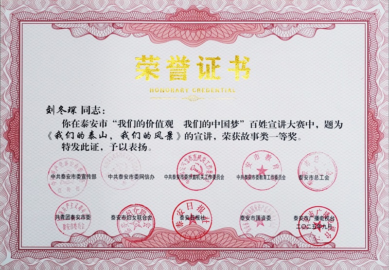 近日,中共泰安市委宣傳部等多部門聯(lián)合主辦的泰安市“我們的價值觀我們的中國夢”百姓宣講大賽結果公布,泰山文旅集團子公司泰山出品公司職工劉冬琛,憑借題為《我們的泰山,我們的風景》的宣講,榮獲故事類一等獎。