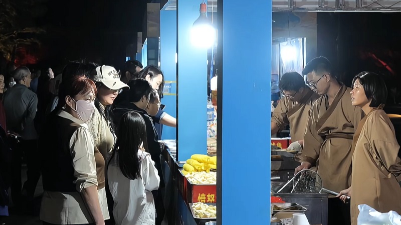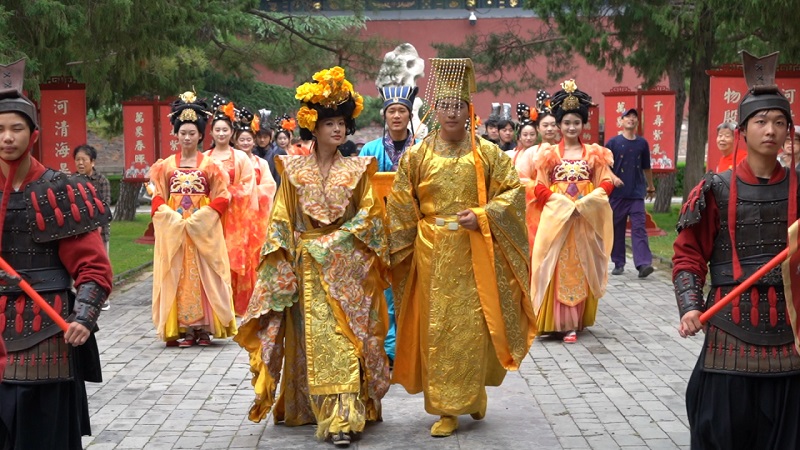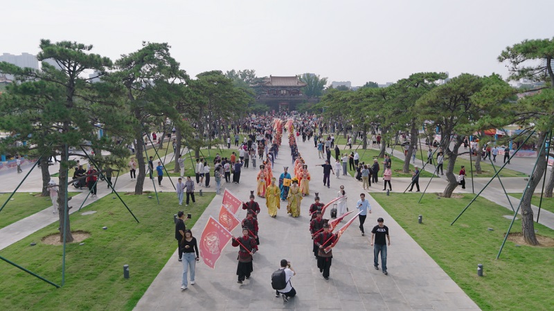 本次文化旅游節(jié)活動(dòng)自10月1日持續(xù)至10月5日,活動(dòng)期間設(shè)置了主題鮮明、層次豐富的特色內(nèi)容。每日10時(shí),來(lái)自中華泰山·封禪大典的演藝團(tuán)隊(duì)以《萬(wàn)國(guó)來(lái)朝·盛世啟市》主題演出拉開(kāi)序幕。天鼓初鳴之際,悠遠(yuǎn)號(hào)角與鏗鏘鼓點(diǎn)交織共鳴,依次呈現(xiàn)開(kāi)場(chǎng)迎賓禮、司禮官肅穆登場(chǎng)、舞姬書(shū)生伴唐宮人物(李治、武則天)盛裝巡游。巡游結(jié)束后,演員們將化身隱藏NPC,身著唐宮華服扮演“帝王”“貴妃”等角色,與游客展開(kāi)對(duì)詩(shī)猜謎、合影互動(dòng)等環(huán)節(jié)