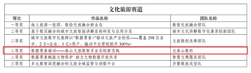 近日,由山東省大數(shù)據(jù)局、中共山東省委網(wǎng)絡(luò)安全和信息化委員會(huì)辦公室、共青團(tuán)山東省委等多部門(mén)聯(lián)合主辦的2025年“數(shù)據(jù)要素×”大賽山東分賽圓滿(mǎn)落幕。泰山文旅集團(tuán)子公司元泰山數(shù)字科技有限責(zé)任公司憑借“數(shù)據(jù)要素驅(qū)動(dòng)——泰山文旅數(shù)智多業(yè)態(tài)創(chuàng)新實(shí)踐”項(xiàng)目,從眾多參賽作品中脫穎而出,獲文化旅游賽道二等獎(jiǎng)。